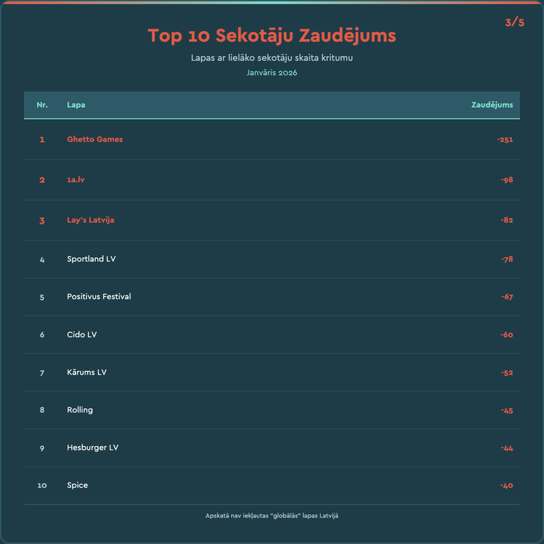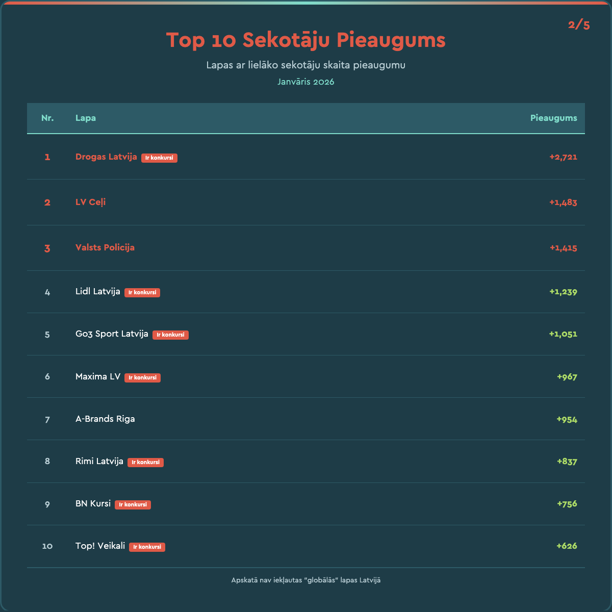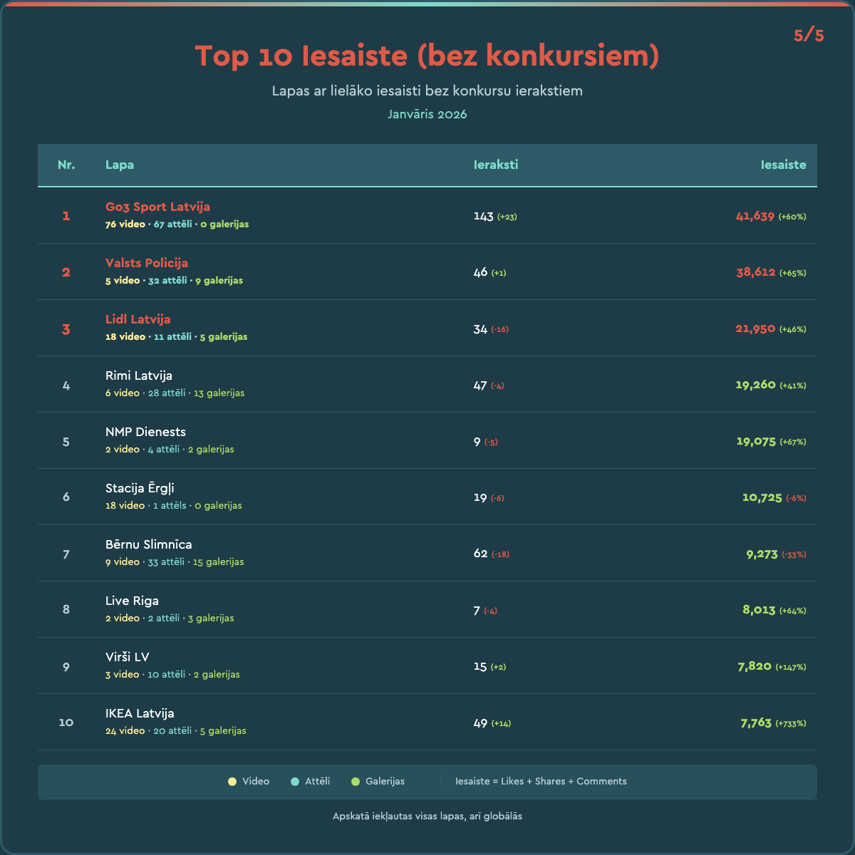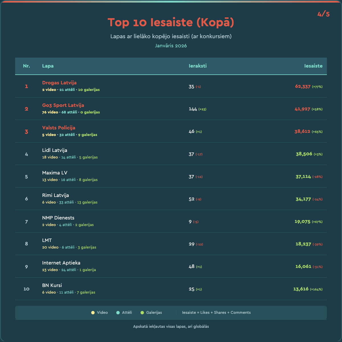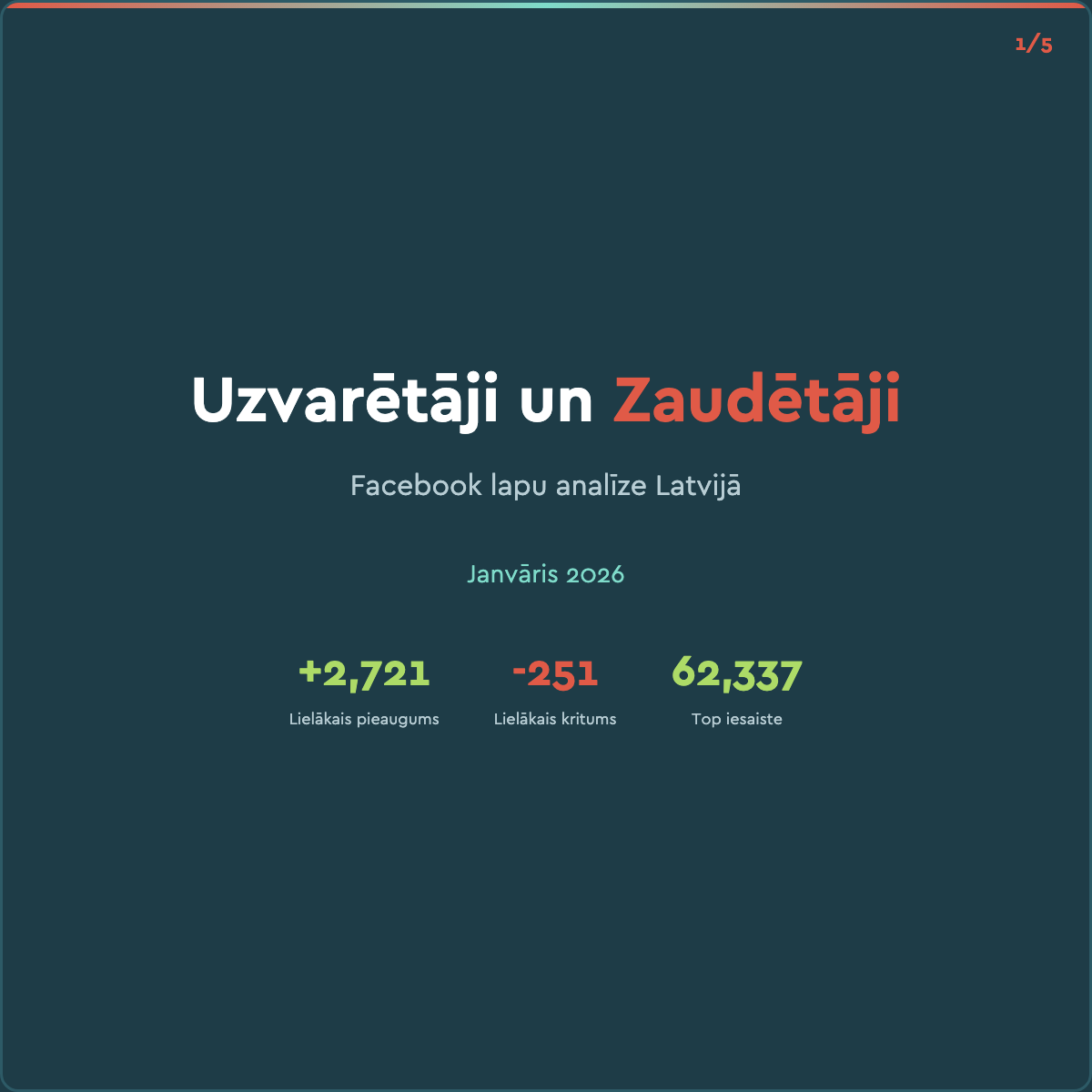 Šeit ir ekskluzīva iespēja pirmajiem redzēt janvāra apkopojumu par Latvijas Facebook lapu dinamiku. Manuprāt, salīdzināties "ar visām" lapām ir parāk virspusēji, tāpēc parasti apskatu lapu pa to kategorijām - salīdzinot sasvstarpējos konkurentus, bet šī ieraksta stāsts ir cits. Kolēģiem Grizzly Riga šos rādīšu tikai piektdienas check-out sapulcē, bet dati ir pārāk interesanti, lai tos nepublicētu arī šeit.